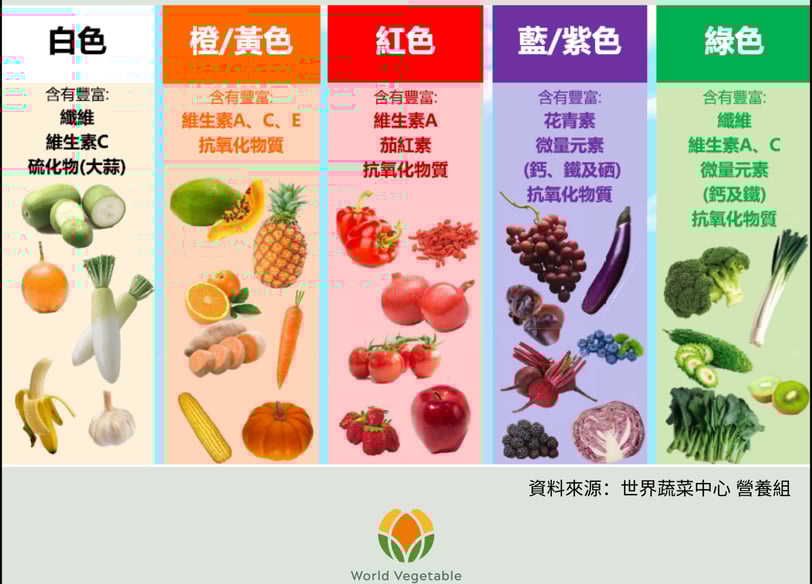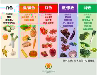蔬果大致可分為紅、橙/黃、綠、藍/紫、白等5種顏色,通常與其所含的營養素和植物化學成分有關,各有各的重要性! 別忘了每天都要努力讓餐盤裡出現一道彩虹!